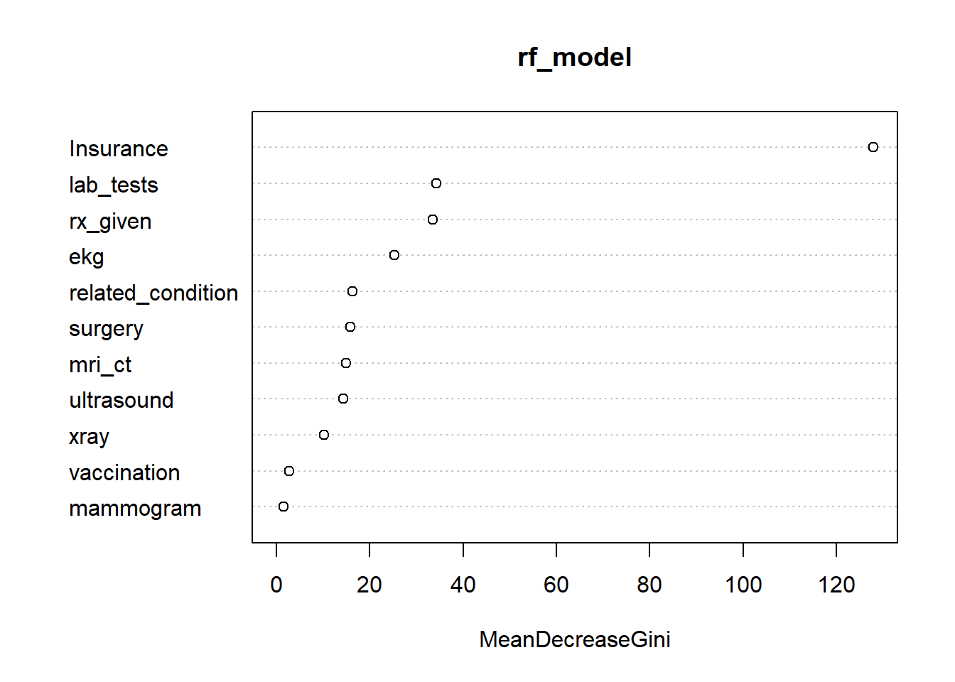The model used 362 trees to achieve the lowest mean squared error. The results showed that insurance coverage, lab tests, prescriptions given, and EKG were the most influential variables for predicting patient admission. In contrast, vaccination and mammogram variables contributed very little, like the findings from the logistic regression analysis. Figure 3 presents a plot showing the relative importance of each predictor in the Random Forest model. Table 3 presents the corresponding confusion matrix, showing an overall accuracy of approximately 82%.