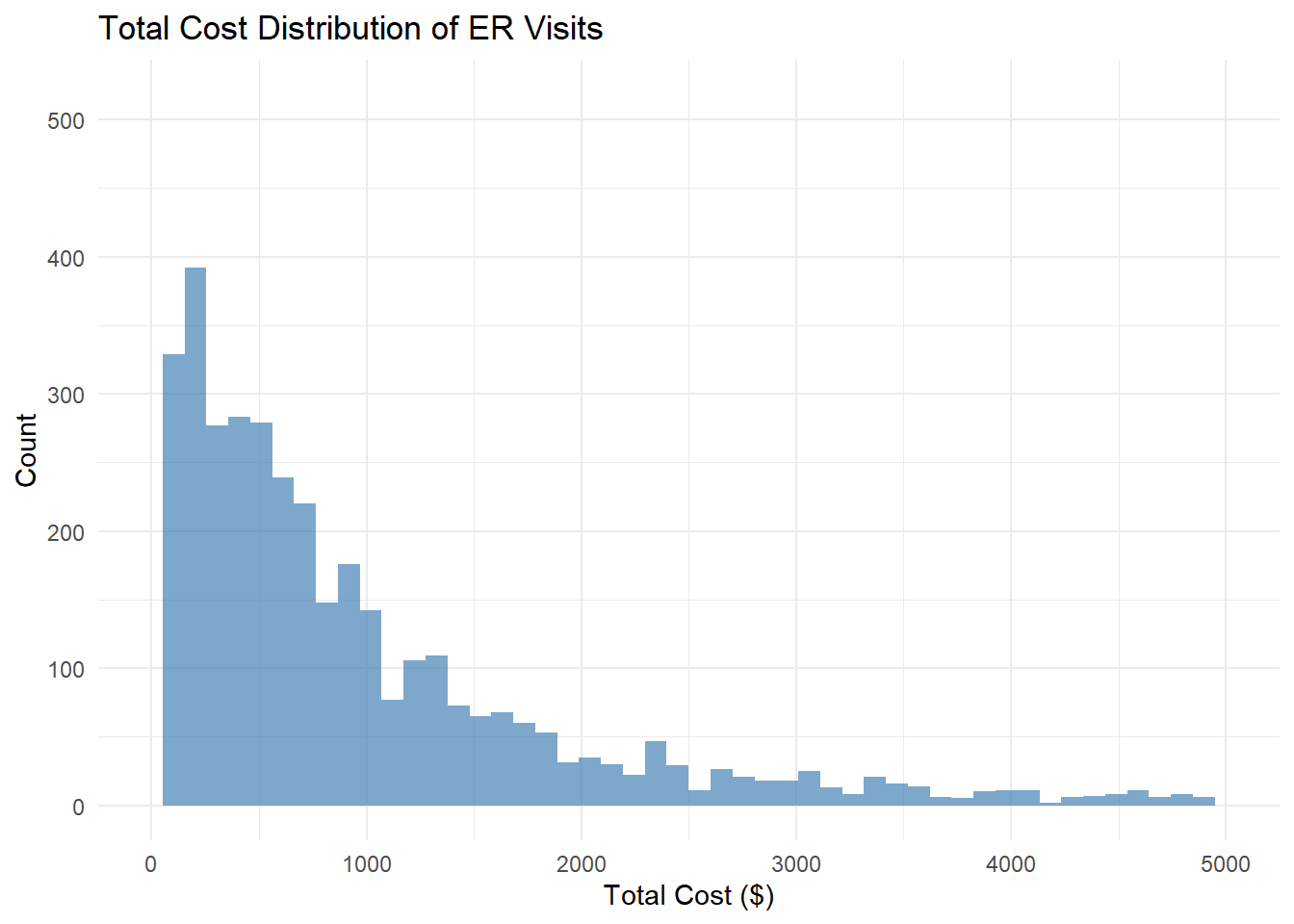 This shows a left-skewed distribution of the total cost distribution of ER visits. There were also 367 cases with 0 costs, while there were 3874 cases with more than 0 out of pocket costs.