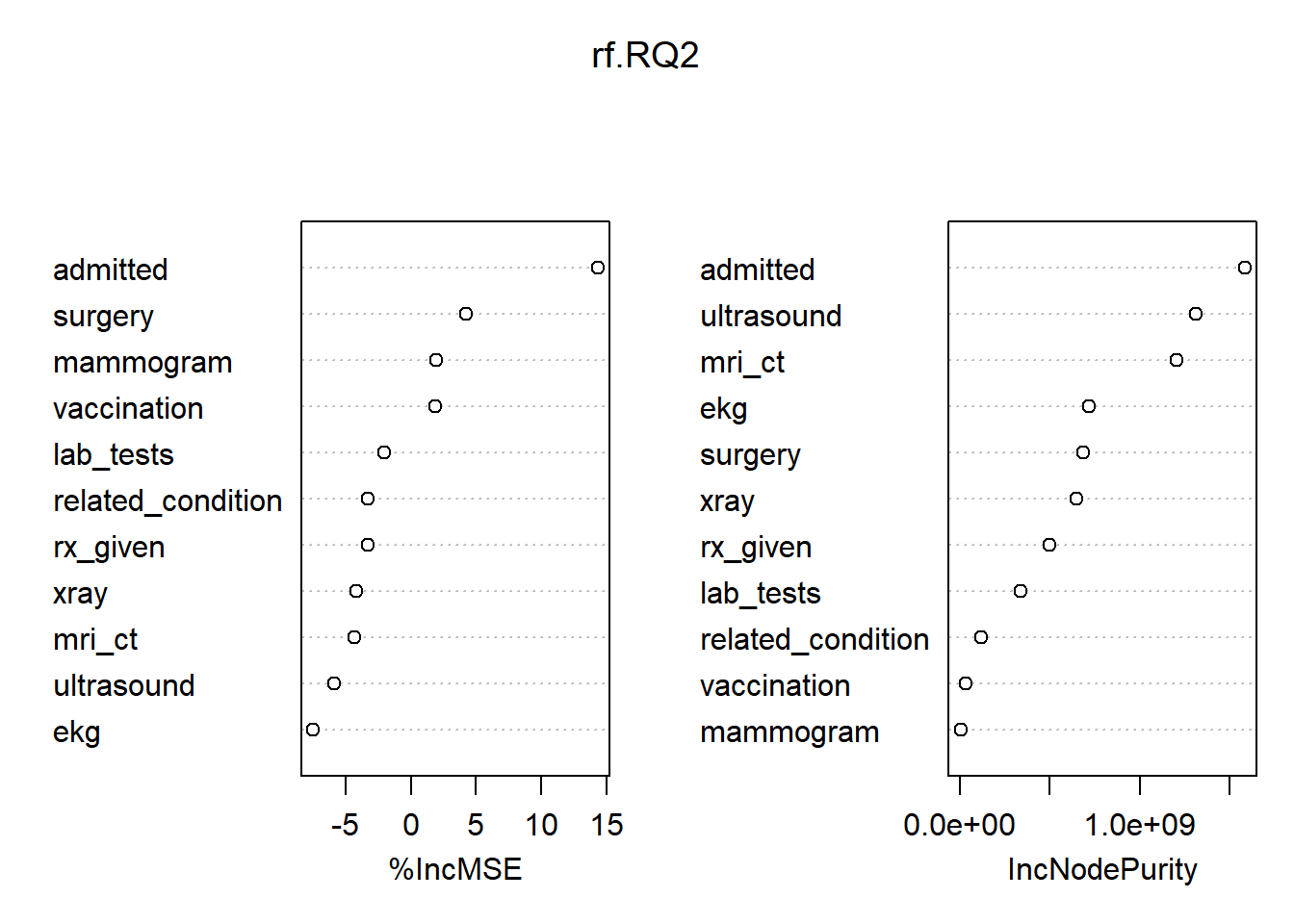 On the training data, the Random Forest showed a low percentage of variance explained and high mean squared residuals, mainly because the extreme outliers had a large impact. The metrics from the test set are more important because they show how well the model predicts data it hasn’t seen before. The strongest predictors for high ER total costs were patients who were admitted in patient and those who had surgery. The other variables had slight or no effects on ER costs. Random Forest model does not tell you the degree of negative or positive effect on ER costs.